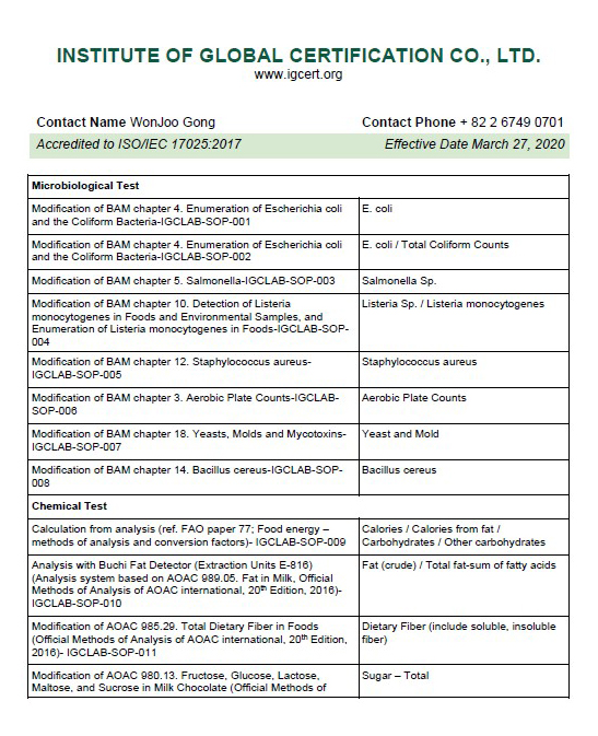 · IAS로부터 ISO/IEC 17025 인정을 취득한 IGC 식품 시험소는 국제적으로 인정된 검사방법인 AOAC 및 BAM에 따라 FDA FSMA 3자 인증을 위한 식품 안전 및 생산현장 안전성 시험 서비스를 제공하고 있습니다.